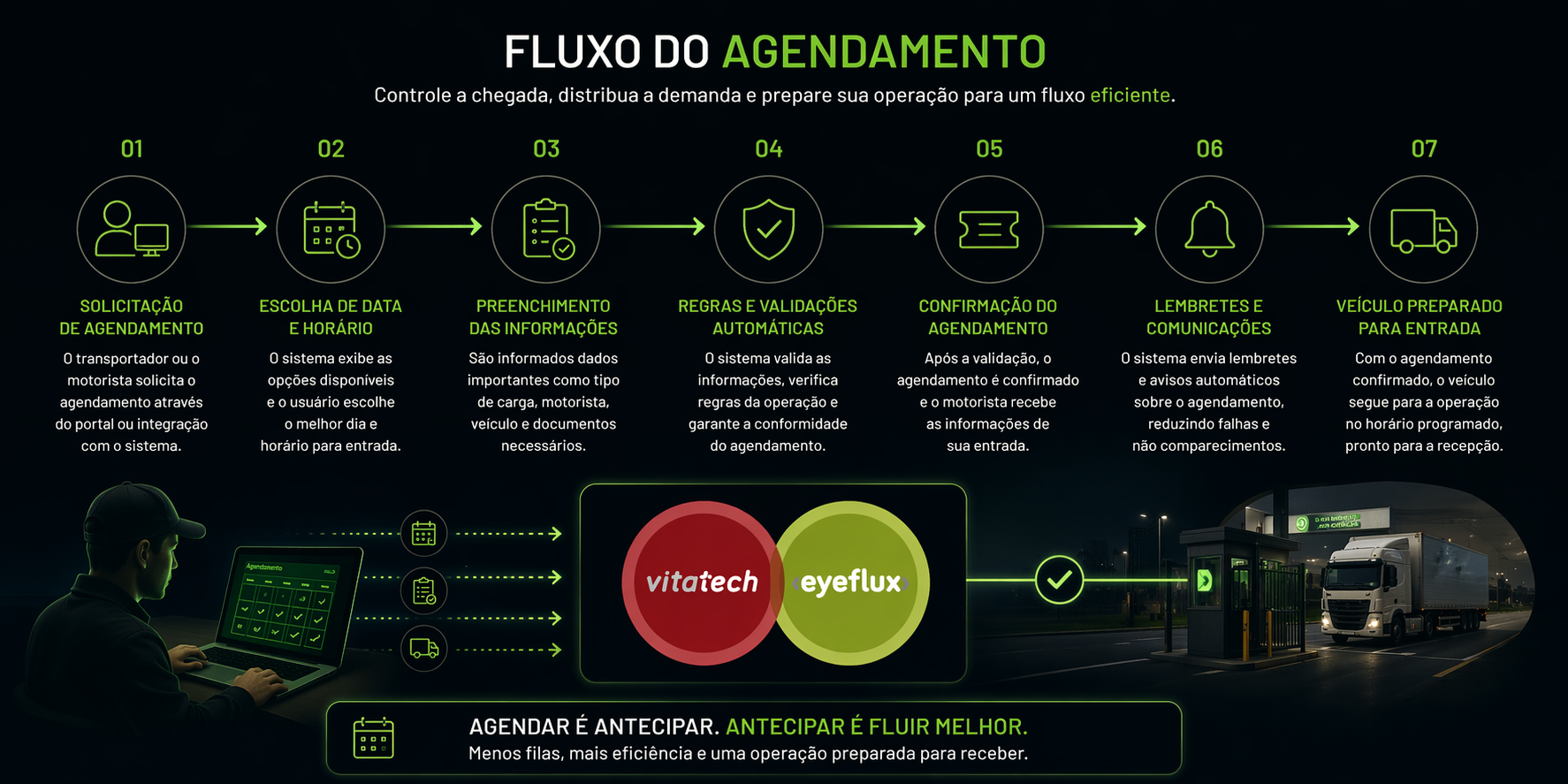 O EyeFlux antecipa esse cenário ao permitir que a chegada dos veículos seja planejada, distribuída e controlada com precisão. Dessa forma, a operação deixa de reagir à demanda e passa a operar de forma organizada desde antes da chegada.