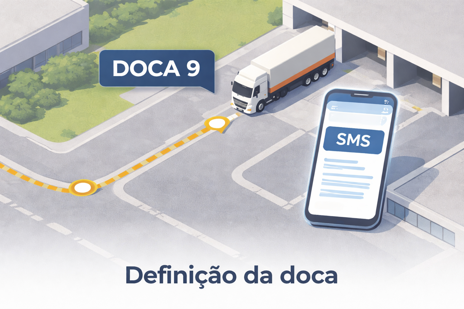 Assim que a tag é identificada na entrada da planta, o sistema cruza as informações do pedido e define automaticamente a doca correta, enviando as instruções por SMS ao motorista.